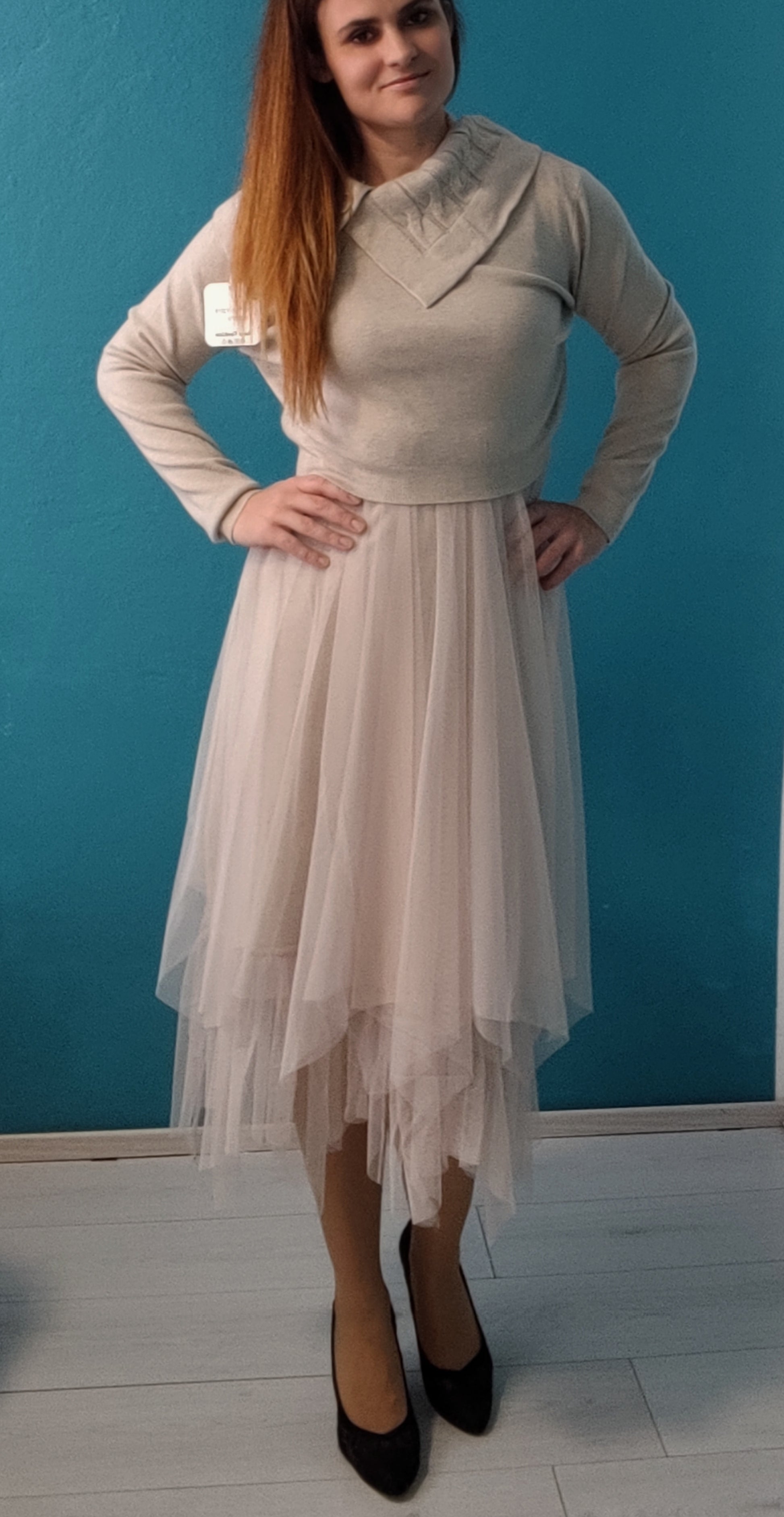 Dvodelna pletena obleka je sestavljena iz obleke bre rokavov in puloverčka, ki ju lahko nosite tudi ločeno. Lahko jo super skombinirate z gležnarji. Ali pa se odločite elegantnejši stil in zraven obujete čevlje s peto. Velikost je UNiverzalna( primerna od S do večjega L)